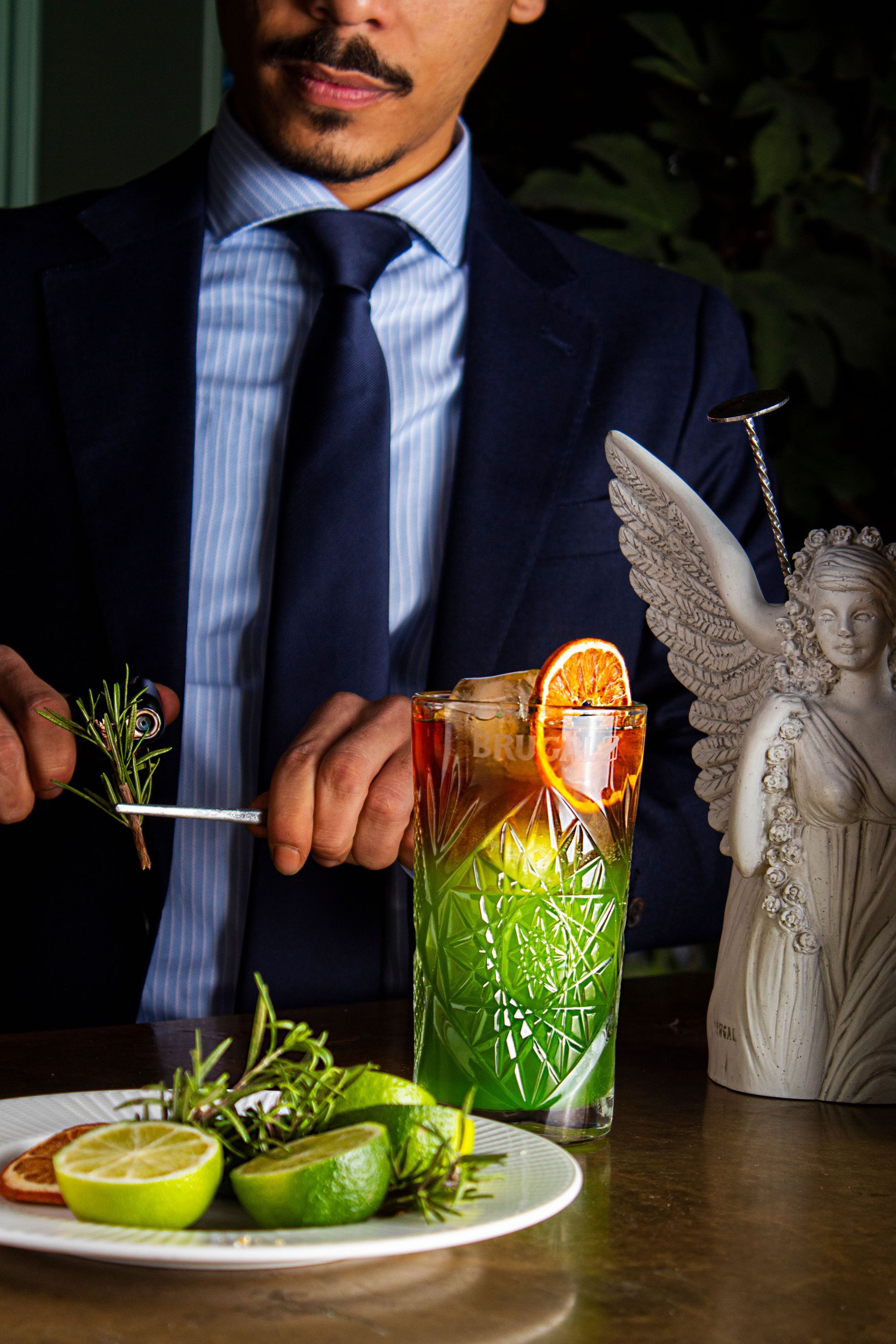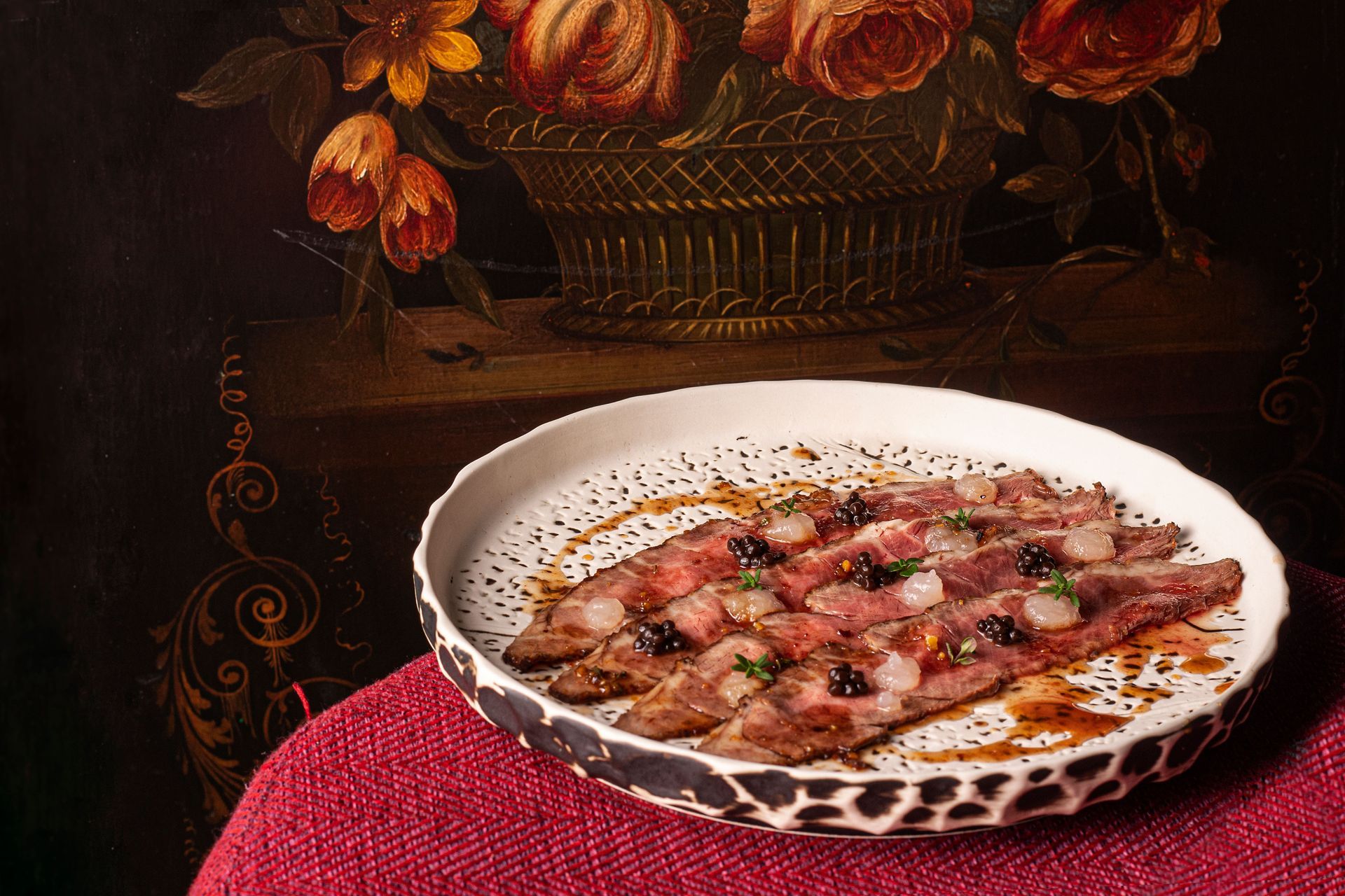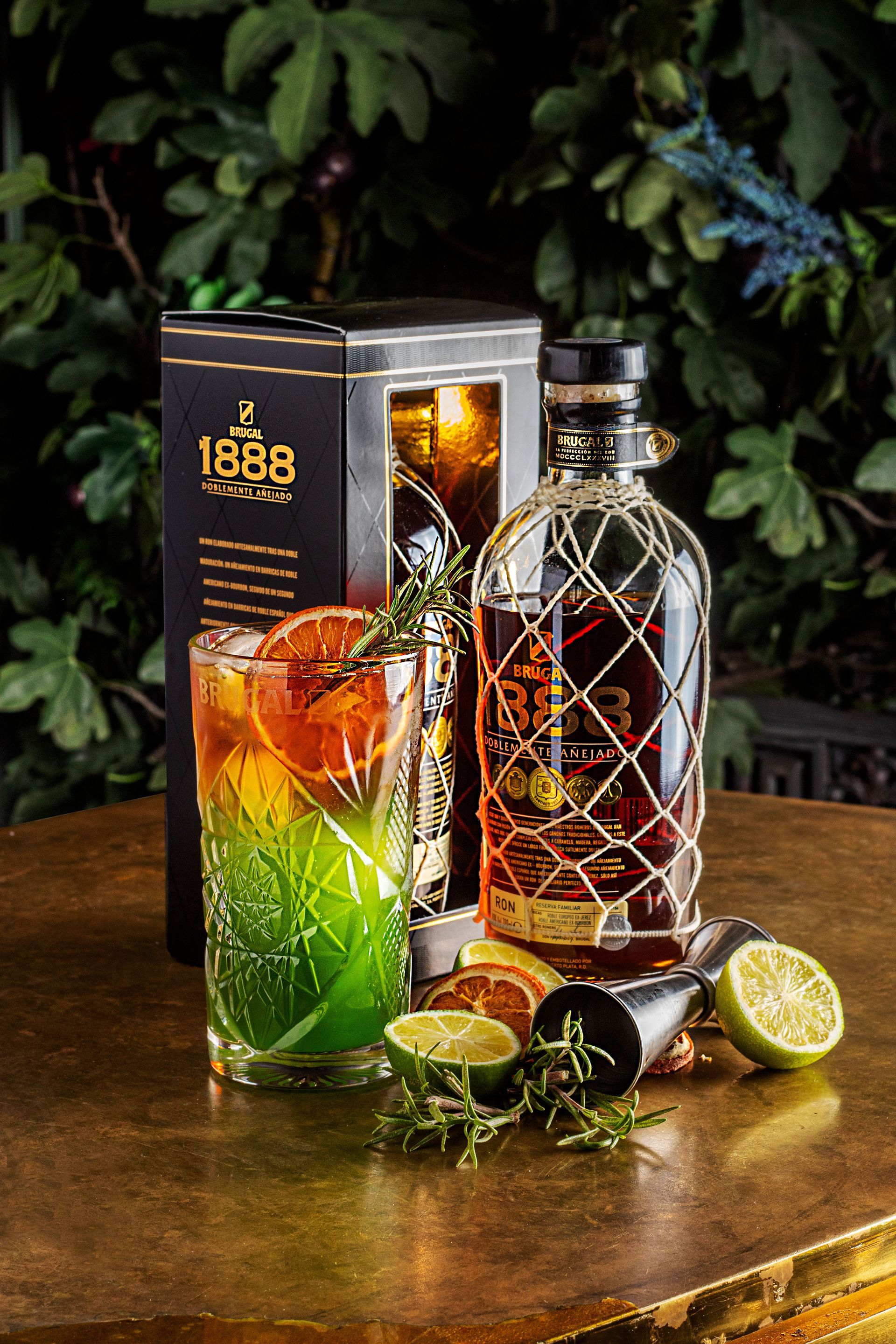 Carpaccio de Presa Ibérica, macerada en Ron Brugal 1888 con palo cortado, gel de jengibre y yuzu y esferificaciones de trufa y una versión del clásico Dark ‘n’ Stormy, elaborado con esta bebida, agua de azahar, lima, ginger beer, oloroso dulce y ahumado de romero.